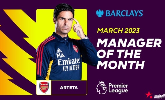 官方消息,阿森纳主帅阿尔特塔当选英超三月最佳主教练。