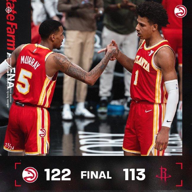 德章泰-穆雷34分6篮板7助攻2抢断率队取胜,萨迪克-贝24分6篮板3助攻,杰伦-约翰逊21分6篮板3助攻2抢断2盖帽,特雷-杨18分4篮板8助攻2抢断,奥孔武11分7篮板。