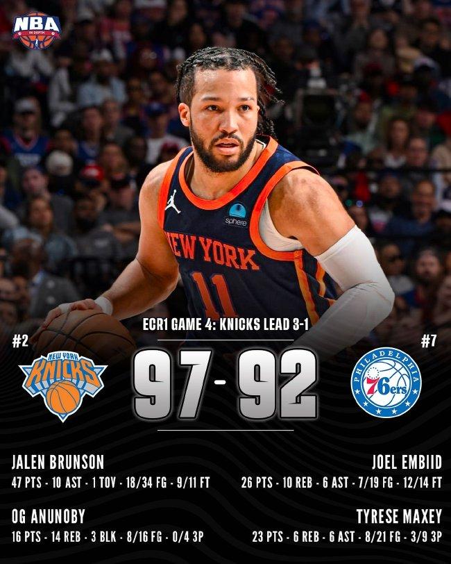 尼克斯(3-1):布伦森47分4篮板10助攻、阿努诺比16分14篮板3盖帽、麦克布莱德13分4篮板、哈尔滕施泰因8分4篮板、哈特4分17篮板5助攻3盖帽